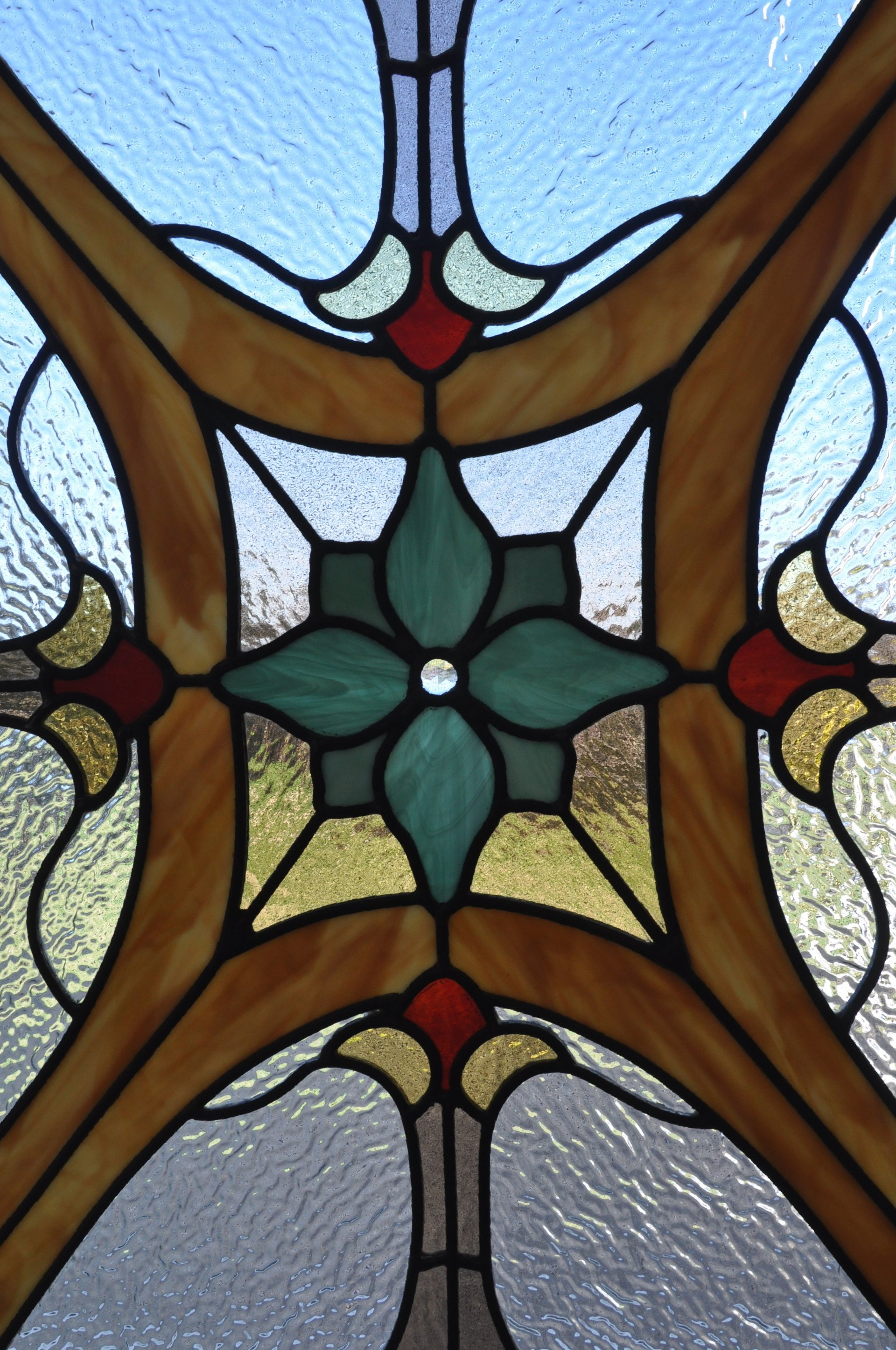 The design for the windows has its roots in the ceramic inserts in the stone walls that are outside in what was once the garden. The inserts were photographed and different aspects were incorporated together to create a design that brings original elements of the estate’s exterior to the interior.